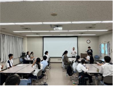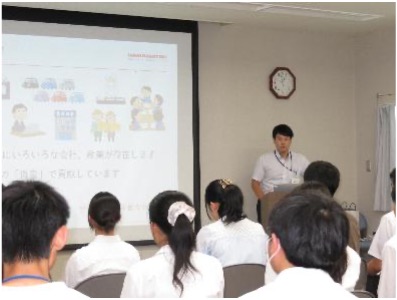 浜松ホトニクス株式会社の紹介の後、同社の中央研究所で製品開発に携わっている3名の研究者(女性2名、男性1名)の皆さんとの交流が行なわれました。最初に研究者の代表の方から、浜松ホトニクス株式会社の使命として光の未知領域を追究し、それを技術に変換し、新しい価値を見出していくことが、この研究所の目標であるというお話がありました。続けて、各研究者の皆さんから、自分が扱う研究領域の紹介や研究者になるまでの経緯が紹介されました。また、そればかりではなく、育児との兼ね合いなど、プライベートな時間との間で如何にワークライフバランスをとるかなど、社会人としての日常にも触れて頂きました。