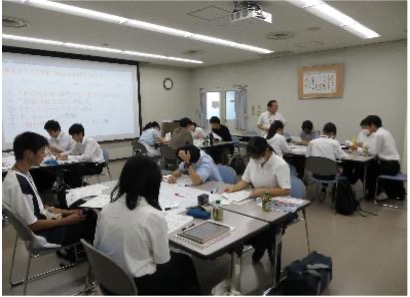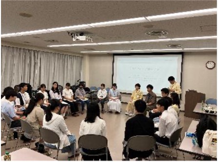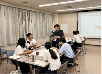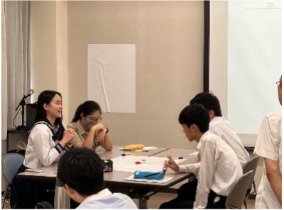 次に、「哲学対話」の時間が設けられました。研究者から「あなたにとって『研究』とは?」という問いが投げかけられ、17名の高校生と3名の研究者が、それぞれ自分の研究観を語る時間となりました。普段高校生たちは、それぞれ異なる研究指導者の下で、別々のテーマの研究に取り組んでいます。研究発表会で研究内容の情報交換をすることはあっても、自分にとって研究とは何かを語り合う機会はありませんでした。また、研究者の方たちからも、会社の仕事としての研究にどう向き合っているのかをお聞きすることができました。和やかな中にも、これまで高校生たちがFSSの研究活動の中で実感したことを反芻し、FSSで学ぶことの意義が深く刻まれる時間となりました。