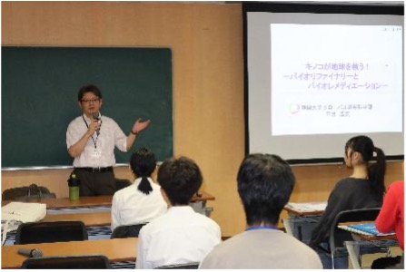 メインレクチャーでは、静岡大学グローバル共創科学部の平井浩文先生が「キノコが地球を救う!-バイオファイナリーとバイオレメディエーション-」というタイトルの講義を担当しました。