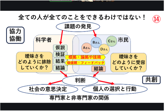講義では、専門家と非専門家の考えの相違点について解説されました。自然科学の専門家である科学者は、ある課題について実証的に追究し結論を導きます。その結論そのものが科学者のゴールです。一方、その結論は時として、非専門家である一般の市民に大きな影響を与えます。一般市民にとっては、その結論がもたらす価値こそに意味があると考えます。この相違点を押さえておくことが、FSS受講生は、将来自分が科学者・技術者になった時、非専門家とコミュニケーションをとる場合に重要であることを学びました。