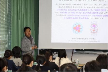 メインレクチャーは理学部化学科 小林健二先生による「分子のかたちと集合:分子から超分子へ」です。小林先生は、有機化学の分野の中でも、分子の自己集合(自己組織化)とその機能を調べる超分子化学の研究をしています。