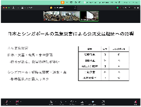グループⅢは、気象災害における公共交通への影響を取り上げました。日本とシンガポールの公共交通の現状を比較しながら、気象災害への対応方針の違いを明確にしました。