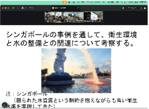 グループⅥは、シンガポールの水資源確保の事例をもとに、日本の水環境を考察しました。両国の国土の成り立ちを比較しながら、社会インフラ整備の重要性を提示しました。